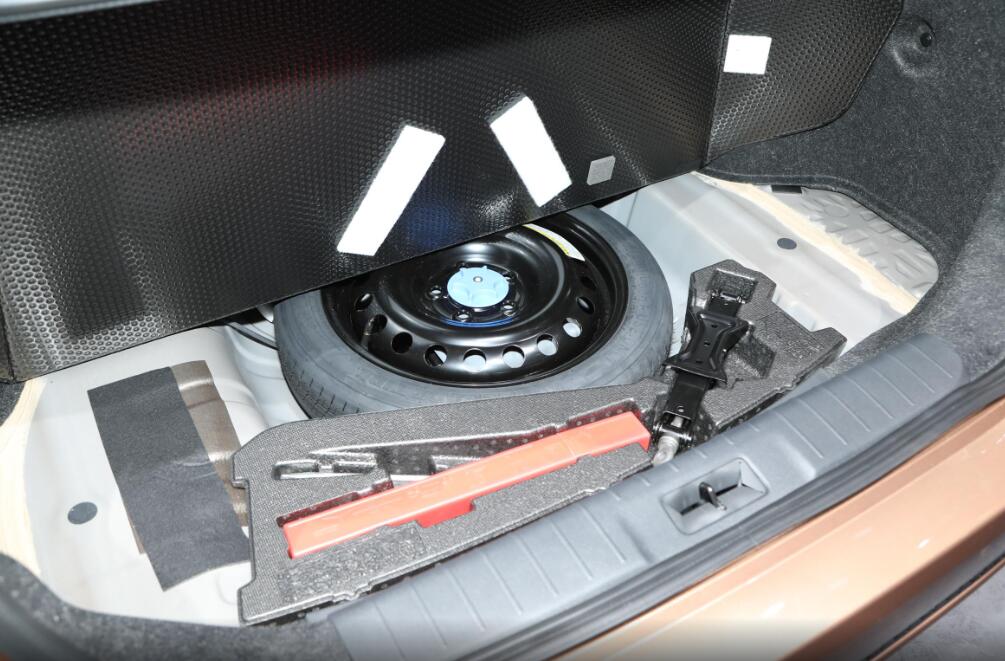 揭開(kāi)內(nèi)襯墊便是軒逸后備箱內(nèi)部的備胎和工具組。非全尺寸的備胎位于后備箱的底部,看起來(lái)是一個(gè)全尺寸的輪胎而不是臨時(shí)使用的小型備胎。而這樣的設(shè)計(jì)裝配,充分考慮到了在發(fā)生輪胎故障時(shí)用戶的長(zhǎng)途駕駛需求。