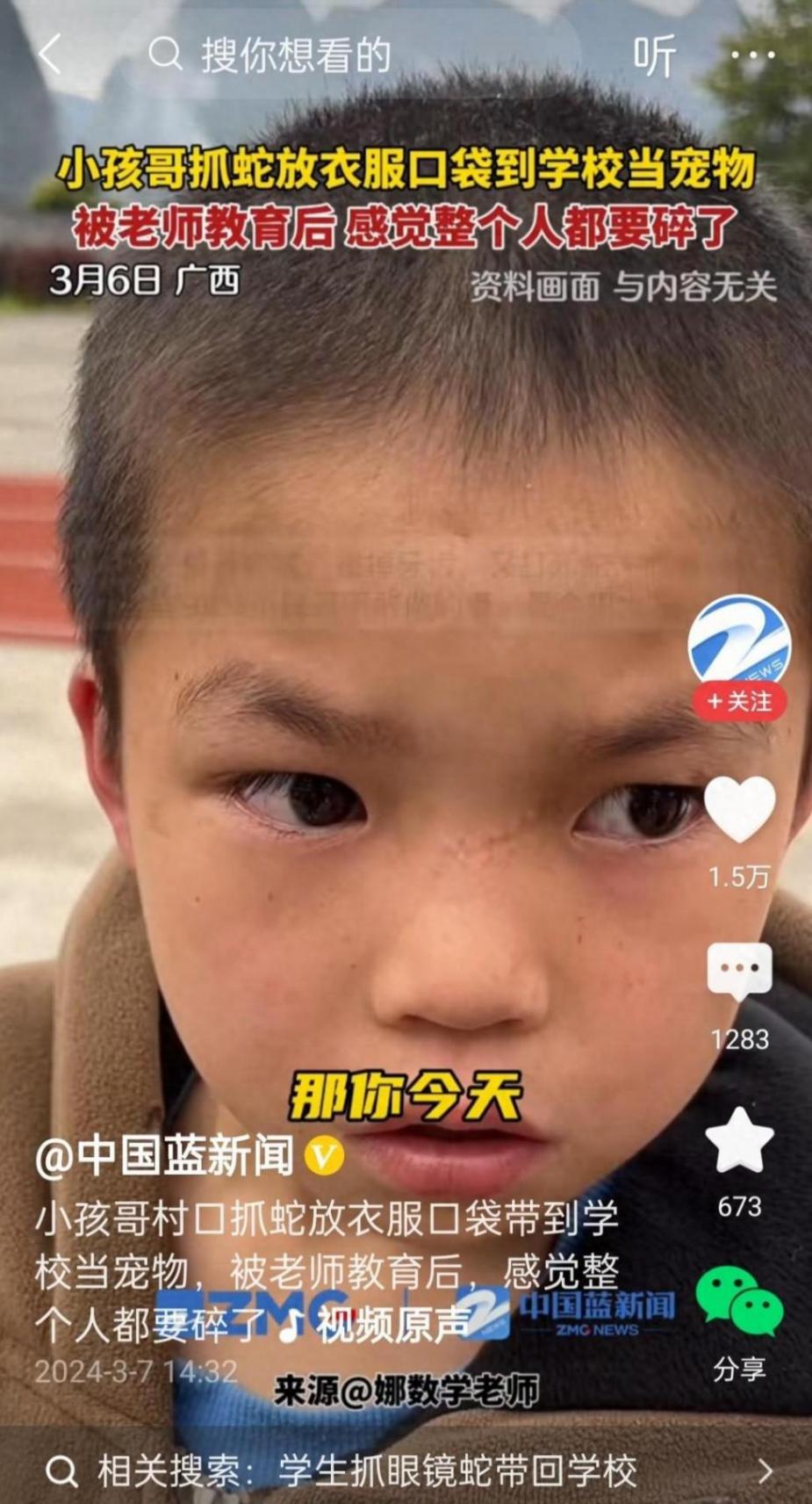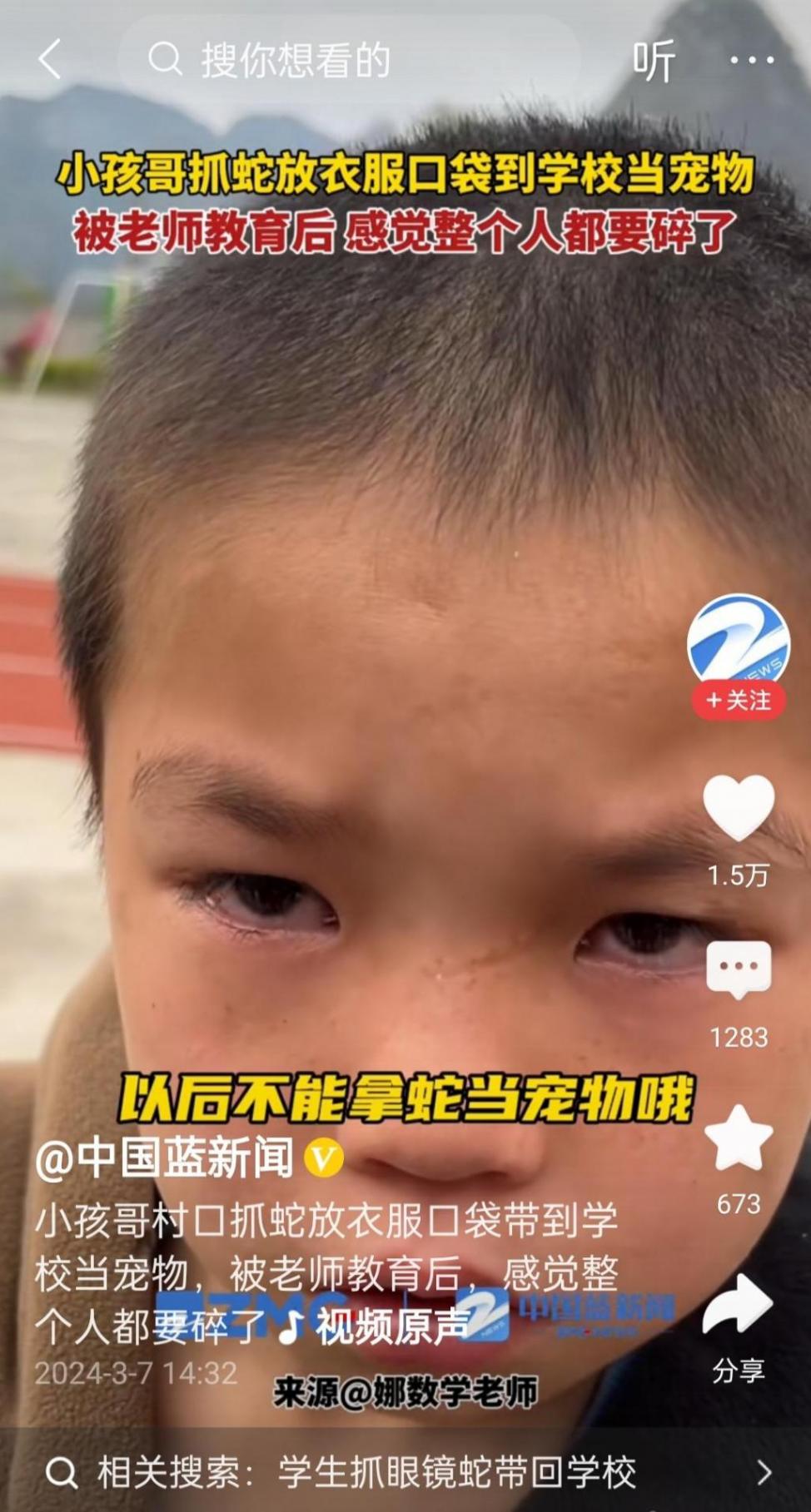 小小的孩子,不僅敢抓蛇,而且還給蛇拔了牙,當成寵物養(yǎng),還放到口袋里帶去學校,這一系列的操作真的讓人瞠目結(jié)舌啊。