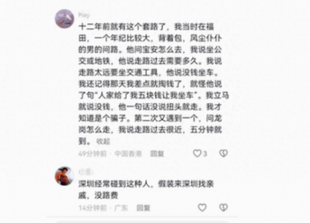 十二年前就有這個(gè)套路,我當(dāng)時(shí)在福田,一個(gè)年紀(jì)比較大,背著包風(fēng)塵仆仆問路。他問寶安怎么去,我說坐公交或地鐵,他說走路過去需要多久。
