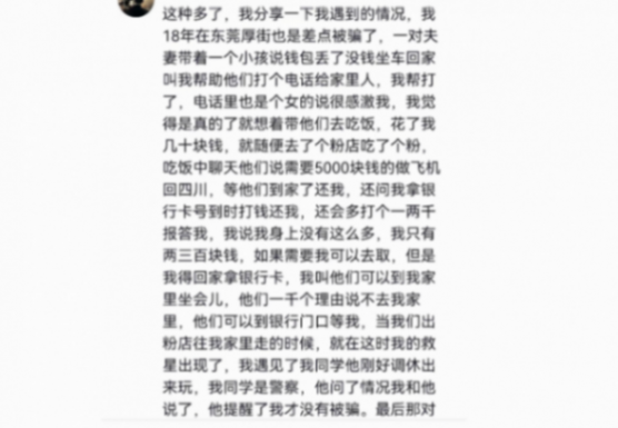 網(wǎng)友小北分享個(gè)人遭遇,18年在東莞厚街也是差點(diǎn)被騙了,一對(duì)夫妻帶著一個(gè)小孩說錢包丟了沒錢坐車回家叫我?guī)椭麄兇騻€(gè)電話給家里人,我?guī)痛蛄耍娫捓镆彩莻€(gè)女的說很感激我,我覺得是真的了就想著帶他們?nèi)コ燥垼宋規(guī)资畨K錢,就隨便去了個(gè)粉店吃了個(gè)粉。