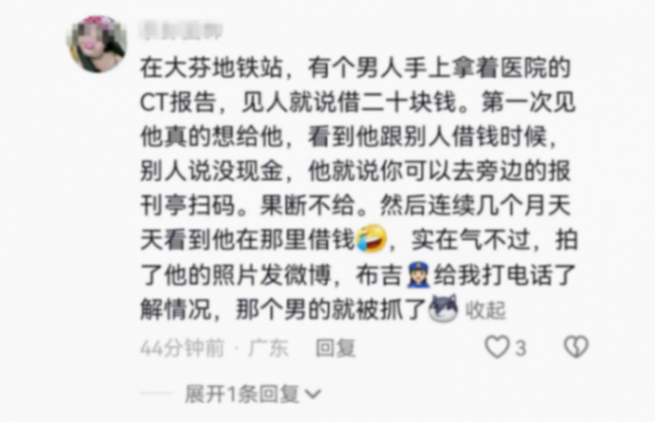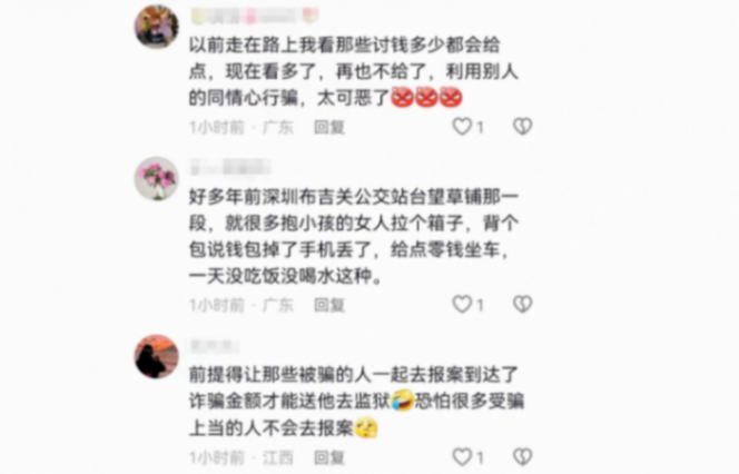 這次被抓男子為王某,他2020年就來深圳,他與親屬一起居住在南山某出租房里面,7年來扮演老人身份,以無錢坐車或吃飯為由博取同情,騙取小額資助,網(wǎng)傳其“行騙二十余年且購買多處房產(chǎn)”消息不實(shí),大家曬出被騙經(jīng)歷,指責(zé)這類人雖然是極少數(shù),但是在社會(huì)上影響極壞,導(dǎo)致了社會(huì)信任危機(jī)。