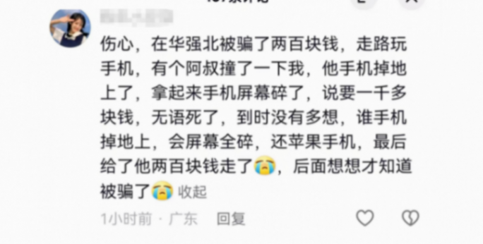 騙子花樣五花八門,還有專門盯著玩手機(jī)的人,通過碰瓷,將手機(jī)掉地上,然后找人索賠,本身即是壞手機(jī),很多時(shí)候都會(huì)選擇花錢息事寧人。