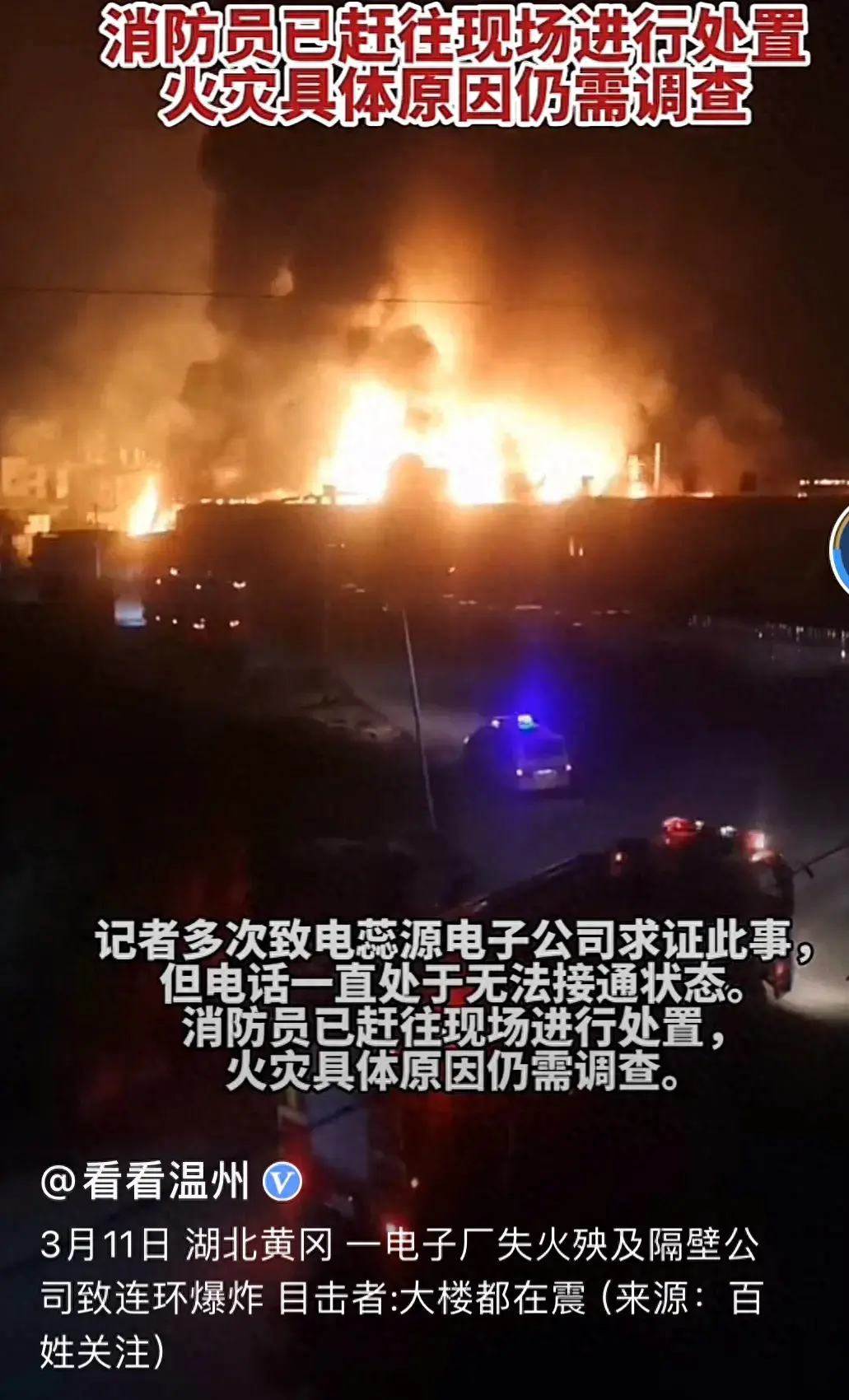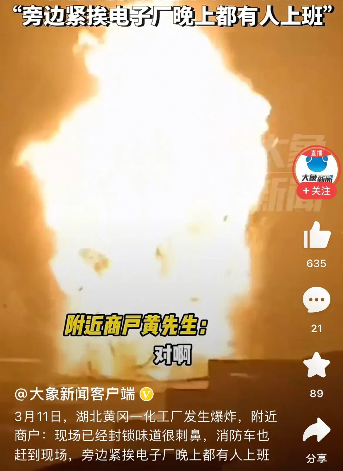 新聞報道,昨日晚間七點半,湖北黃岡的一個化工廠發生了接連四五次的爆炸,現場有毒烈的刺鼻化學品味道,消防車迅速趕到并在第一時間參與救火。