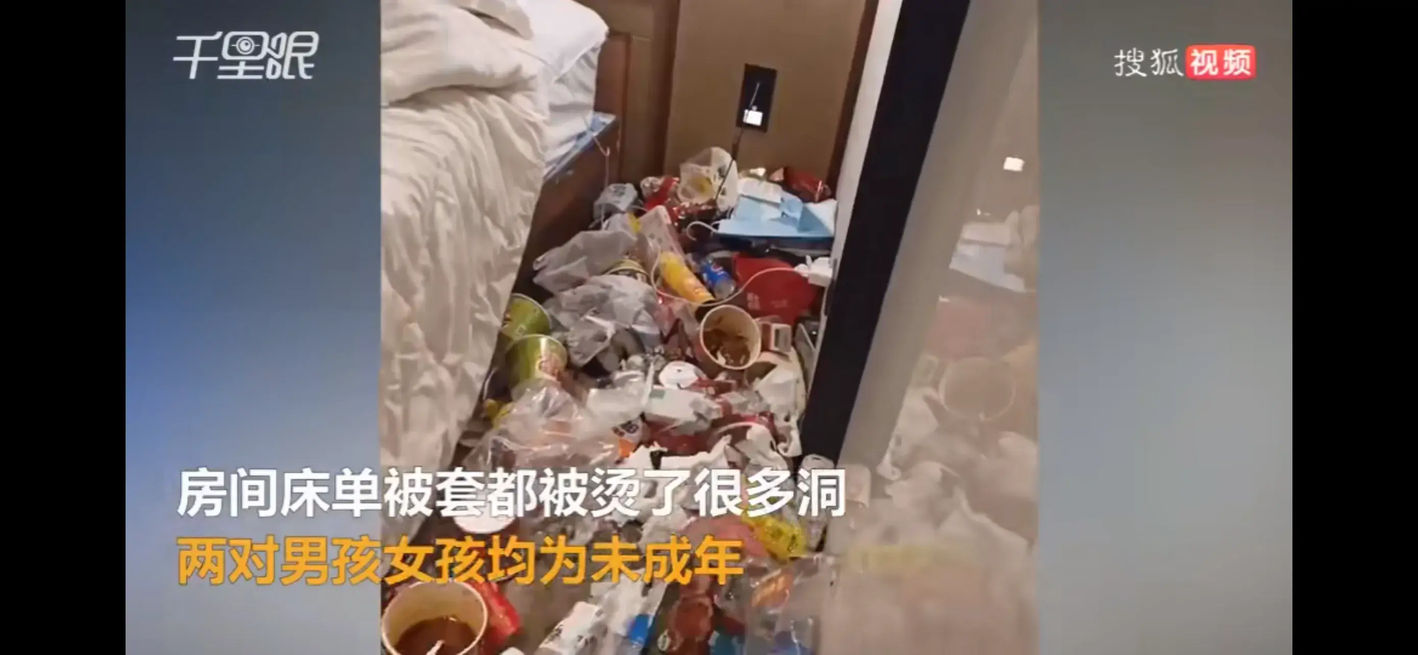3月15日湖南長(zhǎng)沙,4名未成年男女混租一間房,將房間弄得一片狼藉。酒店工作人員回應(yīng)稱,4男女混租三個(gè)月,期間不讓打掃房間,后續(xù)退費(fèi)酒店方還是退還了押金。退房后酒店打掃衛(wèi)生耗時(shí)近5個(gè)小時(shí),發(fā)現(xiàn)房間床單被套被燙了很多洞。期間酒店與家長(zhǎng)聯(lián)系也管不了,最后實(shí)在受不了才勸退。