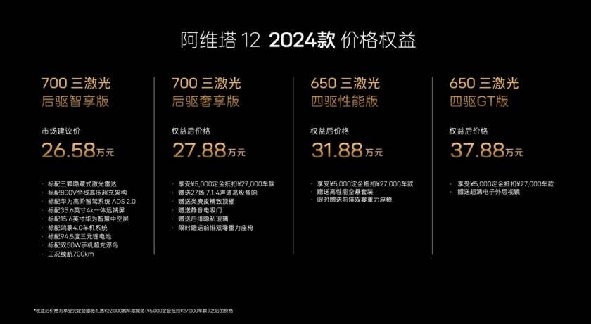 阿維塔12 2024款,在現有車型配置上,進行了全面升級,實現配置翻倍,權益也翻倍。針對本次煥新上市,阿維塔科技推出了豐厚的購車禮遇:2024年4月30日前下定,即可享四大限時政策,5大基礎權益,至高優惠32000。此外,針對阿維塔12的老車主用戶也準備了價值超高的關懷禮,讓老塔友們都能免費終身享受華為ADS高階智駕功能。