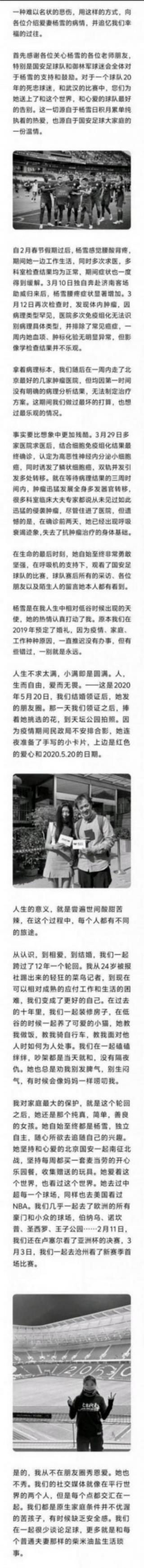 4月3日訊 在國安女球迷楊雪不幸于4月2日去世后,她的丈夫張雅勛在社媒發文,介紹了楊雪生前的病情情況并追憶了他倆的幸福時光。