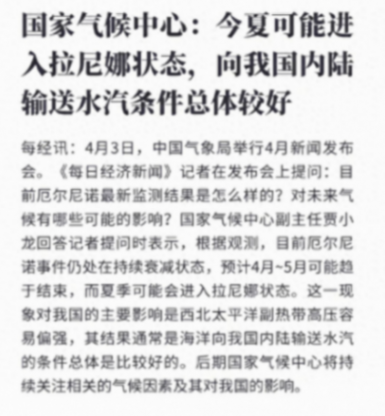 中新社北京報道,中國國家氣候中心副主任賈小龍透露,目前厄爾尼諾事件正在持續衰減,并預測夏季可能會轉為拉尼娜狀態。自2023年5月開始的厄爾尼諾事件,到2024年1月開始衰減,達到了中等強度的峰值。賈小龍強調,國家氣候中心的最新監測結果顯示,此次厄爾尼諾事件正逐漸減弱,預計將在2024年4月至5月期間結束。隨著厄爾尼諾的衰減和可能出現的拉尼娜狀態,預計西北太平洋副熱帶高壓將持續偏強,這將有利于海洋向中國大陸輸送更多的水汽,從而造成中國東部地區的降水偏多。