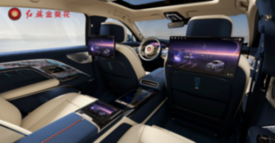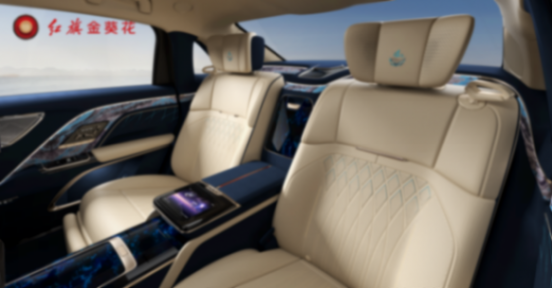 內(nèi)飾采用呼應(yīng)外觀的米白色+藍(lán)色雙拼色設(shè)計(jì),中控臺(tái)面以及門板處加入特殊的彩繪圖案,以此來(lái)彰顯高級(jí)感,前擋風(fēng)下方配備了懸浮時(shí)鐘,再加上帶有金葵花標(biāo)識(shí)的雙色方向盤、扶手箱區(qū)域的中軸線,再度強(qiáng)化了尊貴感。四座版本的中央扶手貫穿前后排,提供兩塊后排娛樂(lè)屏以及扶手箱觸控屏。