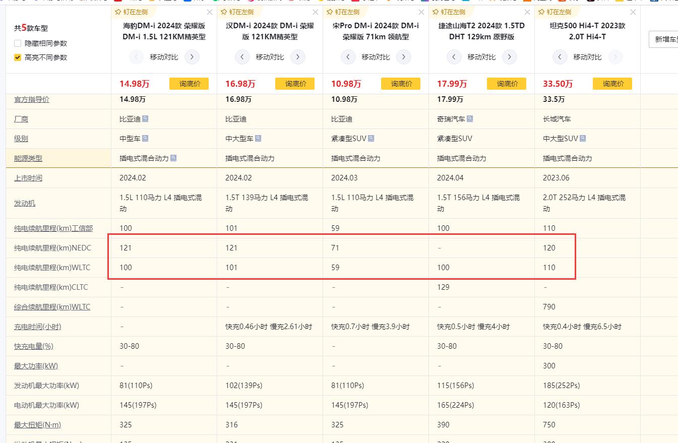 我們直接對比市面上的那些插電式混動車就知道了,不管是比亞迪的海豹DMI,漢DM還是宋Pro,還是奇瑞的捷途山海,又或者是長城汽車的坦克500系列,都有個繞不開的話題,那便是他們的純電續(xù)航都特別短,普遍只有100多公里,在很多人看來,100多公里夠開就行了,但是,大家是忽略掉了車主的想法。
