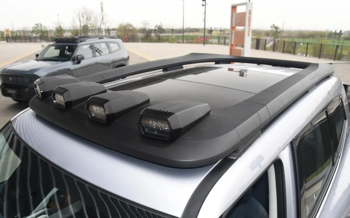 車身側面,A、B、C柱采用隱藏式設計,營造出懸浮式車頂的視覺體驗;輪胎的規格尺寸為265/65 R18,接近角27°、離去角31°,側裙處和輪拱處的結構比較厚重,有不錯的通過性。為了更好滿足戶外需求場景,深藍G318還提供了原廠選裝車頂行李架射燈,射燈為六邊形造型,在露營和穿越時提供更好的環境照明。同時車頂行李架能承載最高300公斤的載重,提高車輛裝載能力。