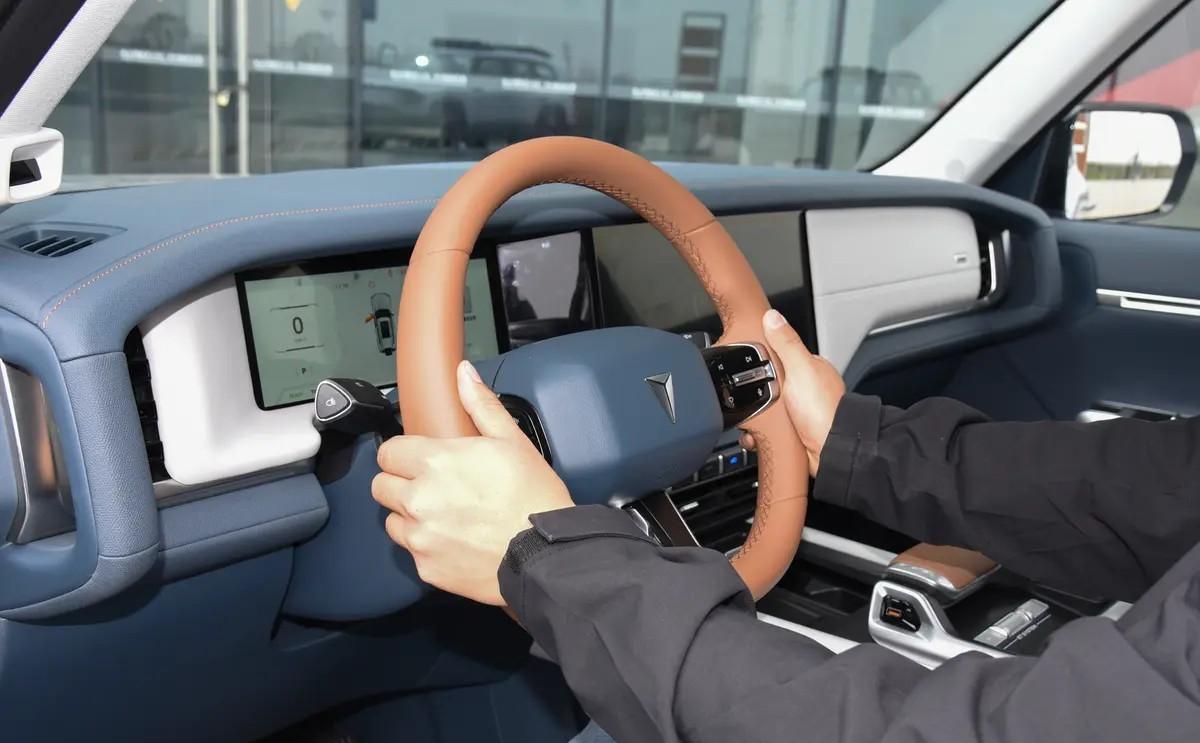 內飾方面,采用對稱“T”字形設計,中控臺設計得比較寬厚,并使用了不少粗壯的鍍鉻飾條,凸顯新車的硬核屬性。14.6英寸中控屏,看著大氣,內部集成了音樂、高德地圖、玩車手冊等應用,同時支持語音控制,基本符合主流車機水平。此外,在下方還保留了實體按鍵和撥桿,方便操控。方向盤采用三輻式設計,整體較為粗壯,真皮面料比較細膩,手感不錯,支持四向調節。