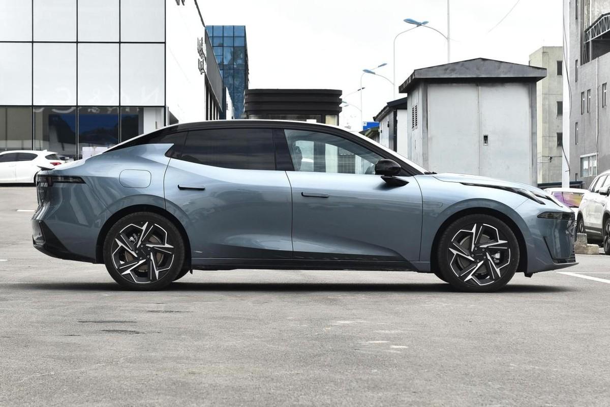 車身側面,黑色涂裝構成了懸浮式車頂結構,領克07 EM-P的腰線分為了上、下、后三段,上腰線會進入到C柱、進入到后風擋的下邊緣之中,下腰線會在側裙上方形成分散的夾角;而后腰線則是短短的一段,從尾燈出發,在油箱蓋附近消失。整個達到4827/1900/1480mm的車身帶有明顯的寬體效果,而2843mm的軸距不是最領先的,但卻也能保障視覺上的修長與座艙內的空間。
