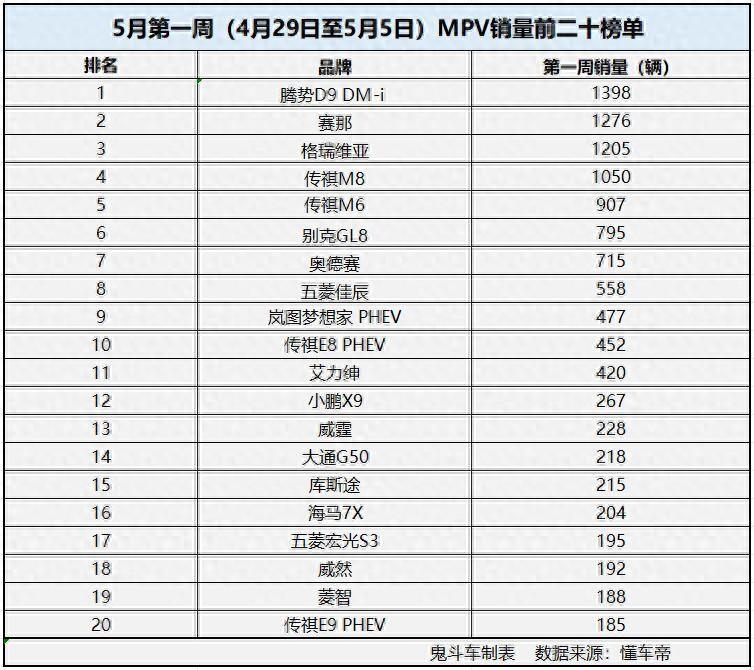 究其原因,很可能由于五一小長(zhǎng)假所導(dǎo)致。那么,在五月第一周,哪些MPV車型銷量高,市場(chǎng)表現(xiàn)更出色呢?接下來(lái),我們一同看看MPV市場(chǎng)5月第一周的銷量榜單。