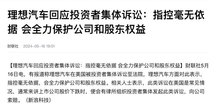 對此次訴訟事件,理想汽車官方在5月16日回應表示:指控毫無依據,會全力保護公司和股東權益。