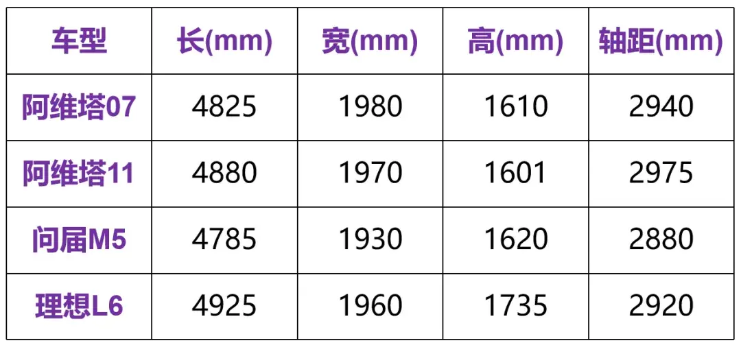 阿維塔07的定位是一臺中型SUV,理論上比定位中大型SUV的阿維塔11級別要低。但看尺寸的話,兩款車的軸距和外圍尺寸都很接近,根本沒有跨級別的差距。