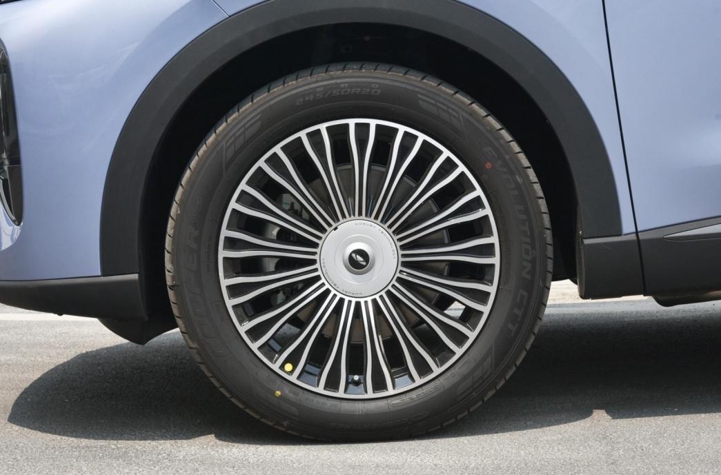 提供19英寸和20英寸兩種輪圈,這臺車是后者,密集細(xì)條幅造型有一定的高級感。輪胎規(guī)格為245/50 R20,胎寬合適,匹配固鉑Evolution CTT系列產(chǎn)品,有良好的干濕地抓地能力。