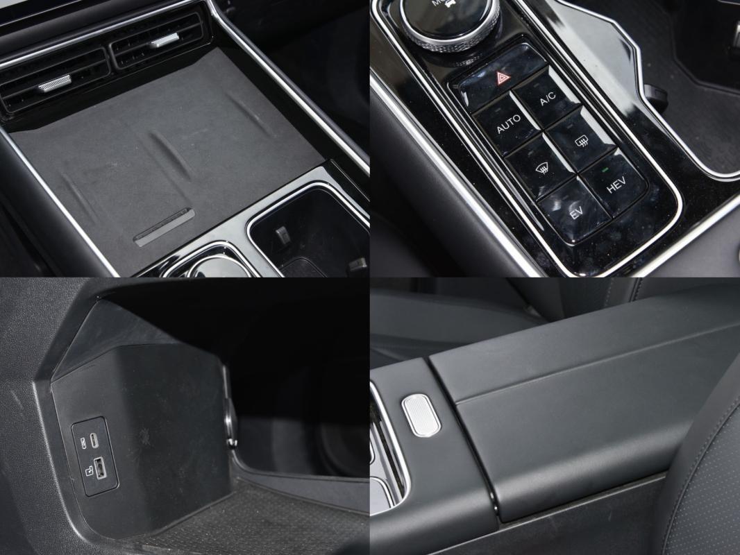 扶手臺以儲物空間為主,但保留了實體控制區(qū),提供常用按鍵和駕駛模式選擇旋鈕。儲物空間豐富,前方雙手機位左側(cè)帶50W無線充電,右側(cè)有雙杯架。扶手箱容積可觀,下方懸浮空間較高,能放置較大件物品,門板儲物格也比較實用。