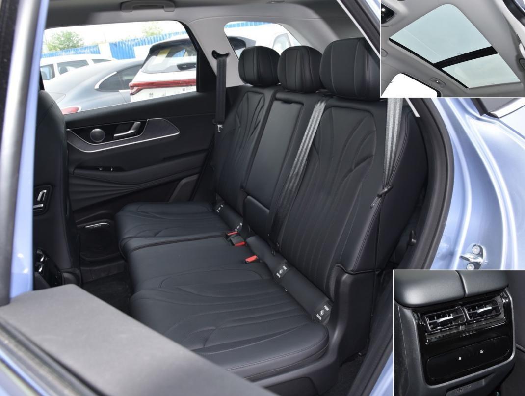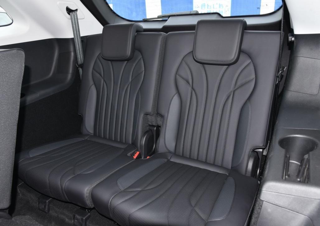 中排座椅坐墊長度充足,靠背支撐性也不錯,坐墊有160mm前后滑動范圍,適應(yīng)性較高??臻g方面,侃弟身高175cm,腿部最多有三拳多,頭頂一拳三指,橫向比較寬闊,乘坐三個大體型男士都沒問題。座椅有便利進出功能,一個動作同步前移和翻起,到后排很便利。配置方面,提供地臺出風(fēng)口和后排獨立空調(diào),還有老板鍵、中央可翻折扶手、車頂有大尺寸全景天窗帶電動遮陽簾。