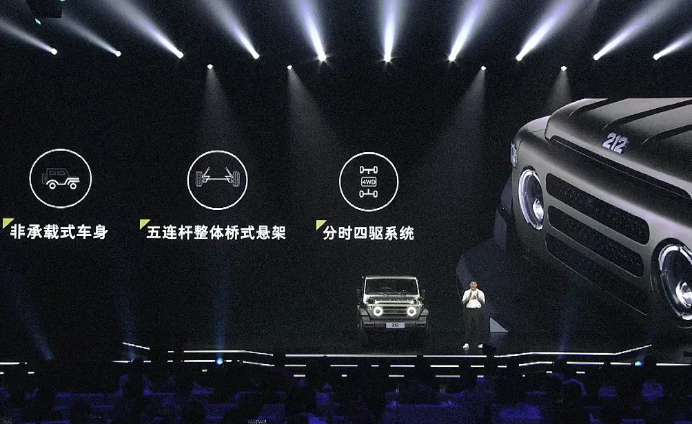 車身尺寸上,全新212也進行了全面升級,新車長寬高分別為4705/1895/1936mm,軸距為2860mm。其前后懸極短,接近角40度,離去角36度,擁有非承載式車身、分時四驅、五連桿整體橋式懸架。