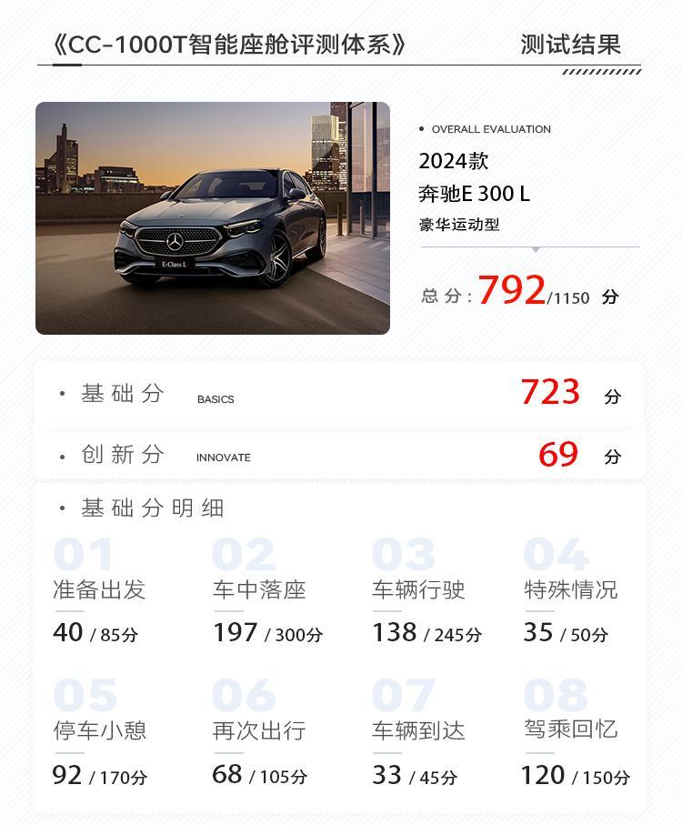 如圖所示,奔馳E 300 L的創新分主要來自于數字化創新和座艙環境創新,從具體功能來看,創新項目主要來自于導航、座椅、空調等。從單項分數來看,沒拿到滿分5分的功能點,在驚喜度、實用性和獨創性三維度上,或多或少還有進步的空間。下面我們圍繞用車旅程,為大家梳理各場景下奔馳E 300 L的創新表現。