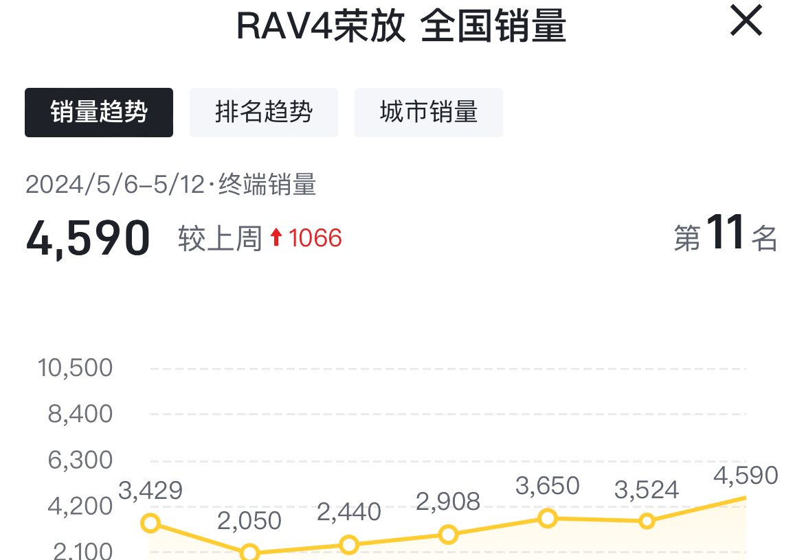 今年的價格戰似乎比往年來到要早一些,相比去年的汽車市場,今年的汽車市場競爭壓力更大,不少車企降價也未能盤活。不過這其中并不包括一汽-豐田RAV4榮放,這款車此次給出的誠意確實較大,根據懂車帝顯示的價格來看,承德地區當地經銷商報價為12.68萬起,與17.68萬的指導價相比,直降了5萬元,加上本身良好的品控以及耐用的特點,成為了不少家庭的首選車型。并且在5月第二周,也就是7天賣出了4590臺,看來降價確實奏效。