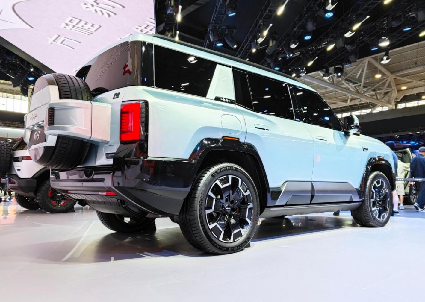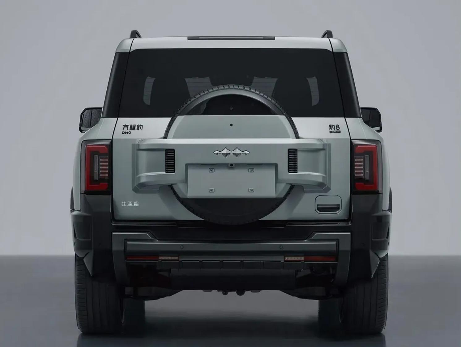 方程豹豹8車尾就和方程豹豹5十分相似,依舊采用側開門設計,背負著全尺寸備胎,不過比起方程豹豹5而言,這個備胎大部分被遮擋住了,看起來更好看。