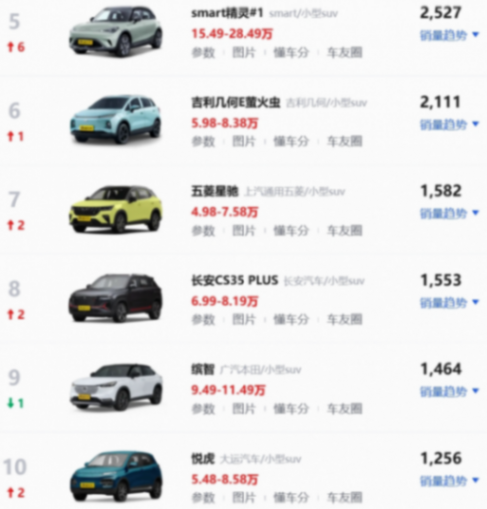 第五名到第十名當中,則只有smart精靈#1(2527輛)、吉利幾何E螢火蟲(2111輛)和悅虎(1256輛)三款新能源SUV,smart精靈#1還實現了近半年來月銷量新高,在售價較高情況下的表現不錯;另外兩款新能源SUV表現就不太理想,尤其是幾何E螢火蟲正在逐漸被市場遺忘。
