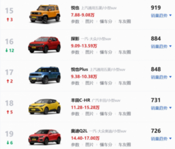 寶駿悅也5月銷售919輛,曾經想要依靠個性化顏值打市場,但現實很殘酷,相比主流純電小型車來說,它的價格還是太貴了,而上市不久的悅也Plus也只銷售848輛;大眾探影銷售884輛,來自國產品牌的緊湊級SUV對他產生的沖擊很大;奧迪Q2L銷售726輛,也是前二十名當中僅有的一個豪華品牌SUV。