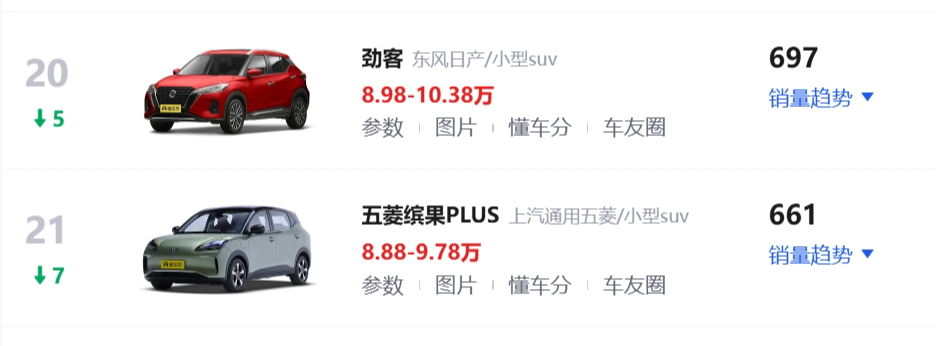 日產勁客銷售697輛,它的命運和本田XR-V差不多,未來的日子肯定會更難;五菱繽果Plus銷售661輛,總感覺五菱除了微型車還能戰斗,其他涉及新能源的產品總是不太容易獲得市場的認可。