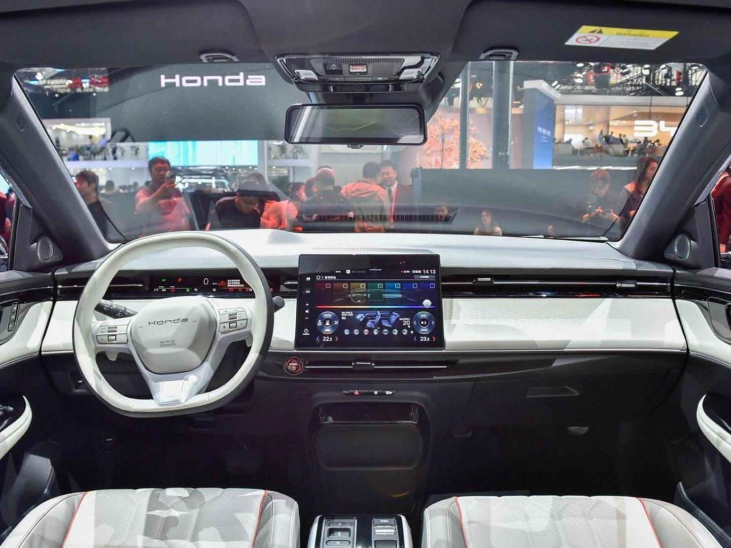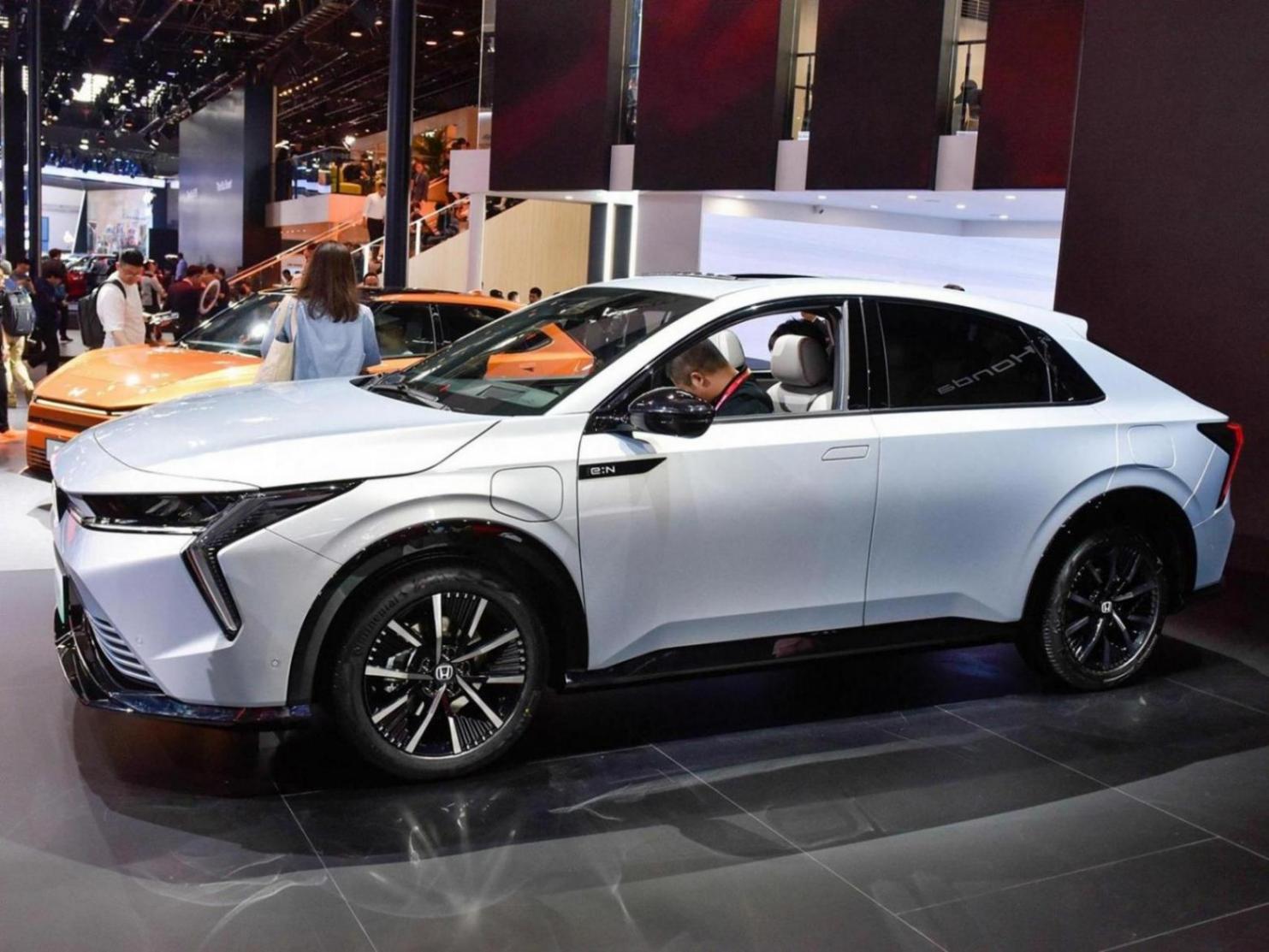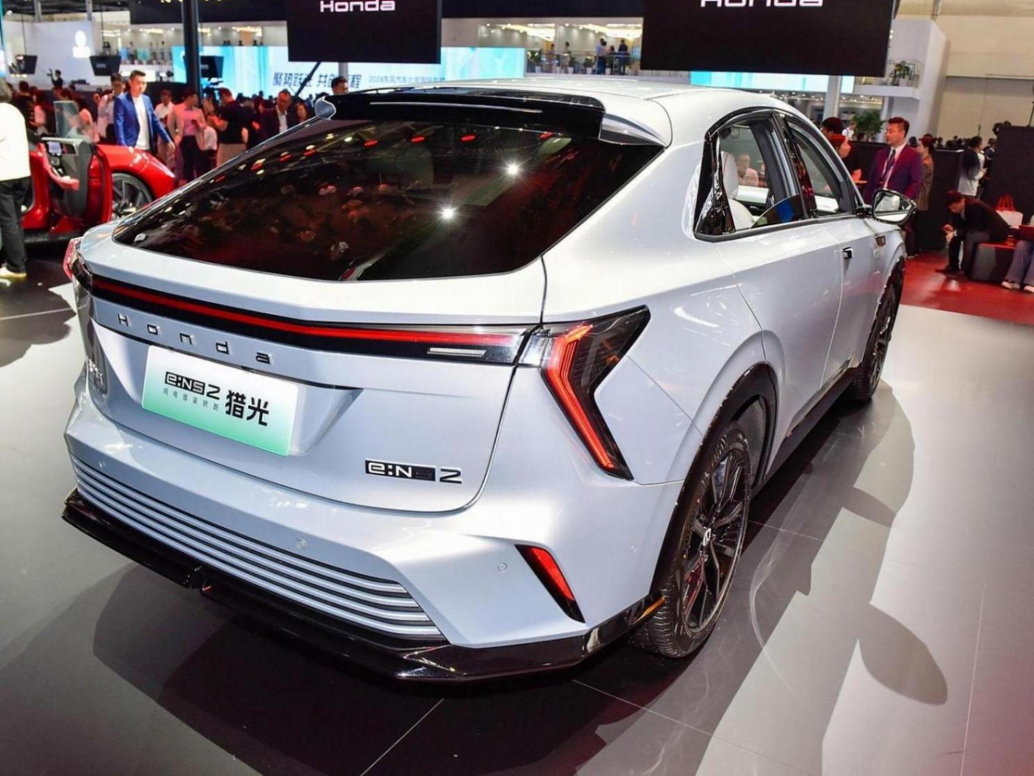 側面造型方面,車頂采用的是溜背式造型,線條感顯得比較干練,腰線則采用了貫穿式設計,點綴出了車身側面的層次感;前門把手采用的彈出式設計,后門把手則被隱藏在C柱部分,本田的燃油車也曾采用過類似的設計。輪眉和側裙部分設計有隆起的筋線,凸顯了力量感;輪轂則是熏黑的多幅式造型,不過風格算不上大氣。