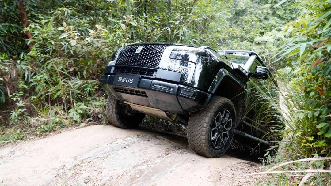 接著在石子路以及陡坡路段時,U8越野玩家版同樣有不錯的越野表現。由于石子路面凹凸不平且石塊較滑,為了避免打滑和提高通過能力,我們打開了后輪差速鎖,并啟動了蠕行模式,防止動力輸出過強車輛出現亂竄的情況,讓車輛以一個平穩的狀態通行。而在將近35°的斜坡上,該車憑借四電機1280N·m的總輸出扭矩,讓該車具備較強的動力輸出,足以較輕松的應對爬坡路段。