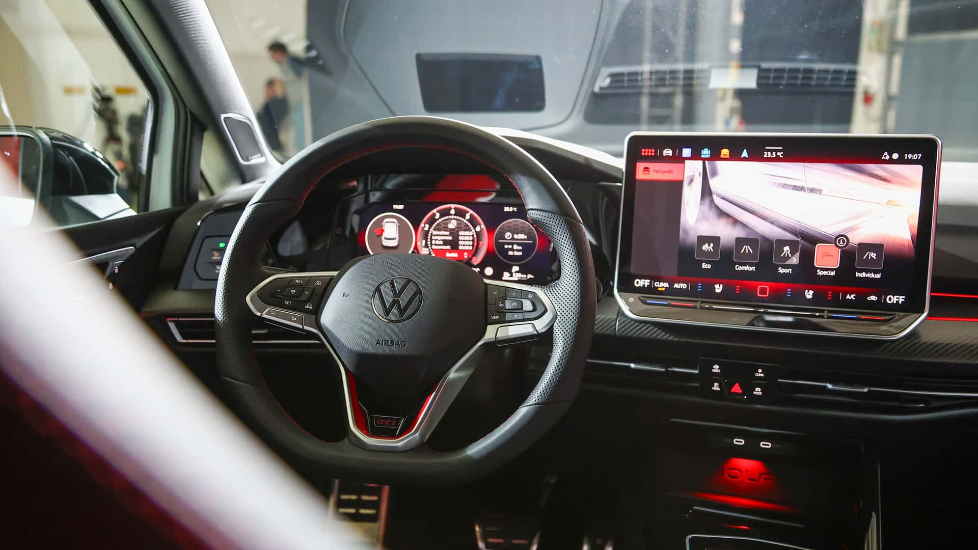 新車內(nèi)部采用與普通高爾夫相同的12.9英寸中控屏,方向盤三九點(diǎn)位置電容觸控按鍵回歸到傳統(tǒng)按鍵式,這是好事。