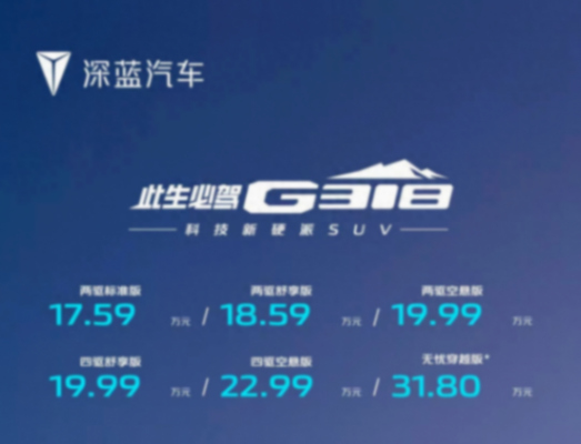 剛剛,深藍G318在拉薩正式上市。具體來看,深藍G318共六款車型,售價從17.59萬到31.80萬元。其中,售價在31.80萬元的頂配“無憂穿越版”目前是開啟預售狀態,預計2025年開始交付。那么這款車到底怎么樣?哪個版本更值得買呢?今天我們就來分析一番。