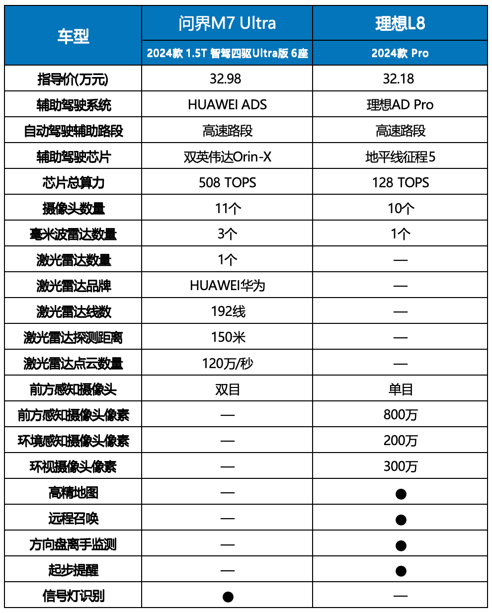 在輔助駕駛硬件方面,問界M7 Ultra的表現都要更好。首先,問界M7 Ultra使用的是雙英偉達Orin-X輔助駕駛芯片,算力是理想L8所搭載的地平線征程5的4倍。而且問界M7 Ultra還加入了1顆激光雷達,并且該激光雷達的線數還增加到192線,相比之前的版本有所升級。所以總體比較下來,這一局問界M7 Ultra勝出。