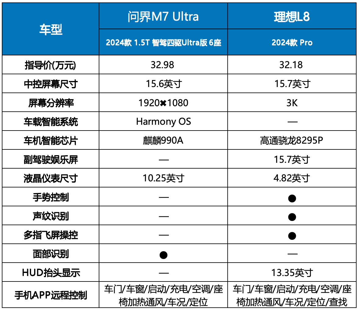在配置對決中,問界M7 Ultra我們選取的車型為2024款 1.5T 智駕四驅Ultra版 6座,售價為32.98萬;而理想L8選取的車型為2024款 Pro,售價為32.18萬,前者比后者多出8000元。下面我們主要來看看它們在配置方面的差異表現。