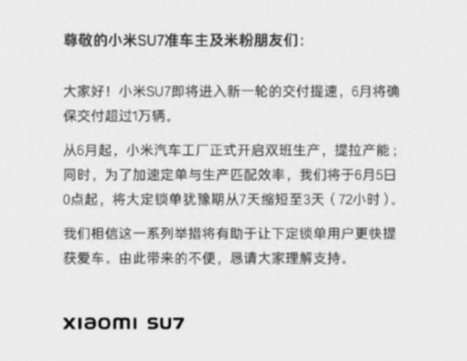 當然,光有產能提升還不夠,定單與生產匹配效率也是關鍵。于是,小米汽車決定縮短大定鎖單猶豫期,從七天縮短至72小時。這意味著消費者在下定后,需要更快地做出決定,否則就可能錯過這輛心儀已久的小米SU7。不過話說回來,這72小時也足夠消費者們好好考慮啦,畢竟買車可不是兒戲,得慎重再慎重。