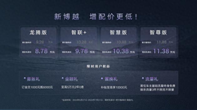 6 月 27 日,吉利新博越上市,官方指導價 9.28-11.88 萬元,限時優惠 8.78 萬元起。