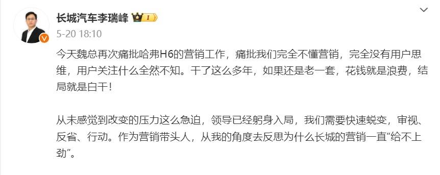 比如其實早在去年,長城汽車就有一批高管集體入駐微博,但不久之后就沒有了聲音。前不久,魏建軍在親自上陣直播后,更是痛批哈弗H6的營銷工作,直指團隊“完全不懂營銷”,完全沒有用戶思維,用戶關注什么全然不知。