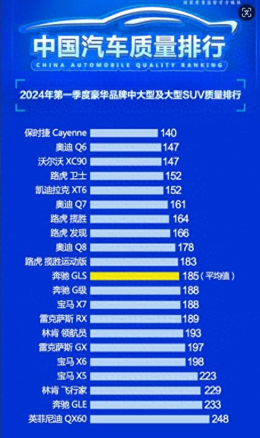 那么,哪些豪華中大型及大型SUV品質(zhì)過關(guān)呢?不妨來看看質(zhì)量測評榜單。日前,中國汽車質(zhì)量網(wǎng)發(fā)布《2024年第一季度豪華品牌中大型及大型SUV質(zhì)量排行》,這份榜單上,共有21款車型參與測評,質(zhì)量測評的平均分達到185分。分數(shù)越小代表車型的質(zhì)量越好,接下來,看看哪些豪華中大型及大型SUV表現(xiàn)得更好?