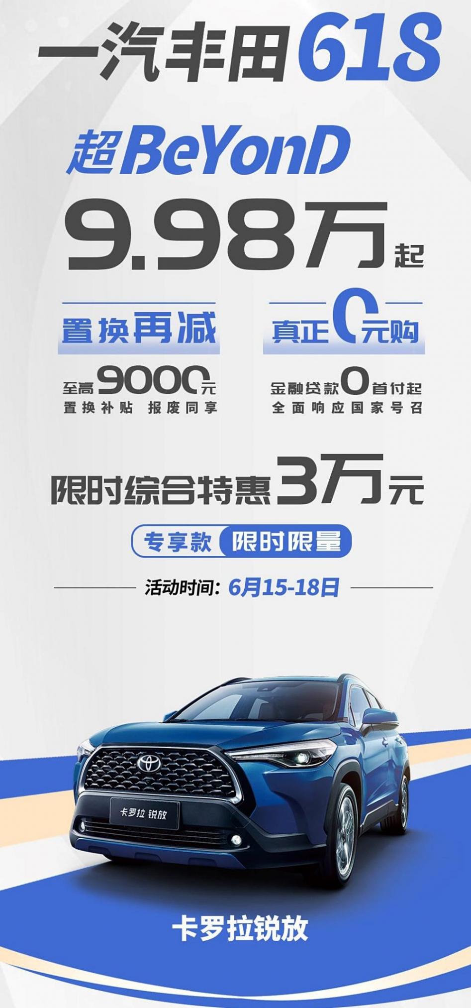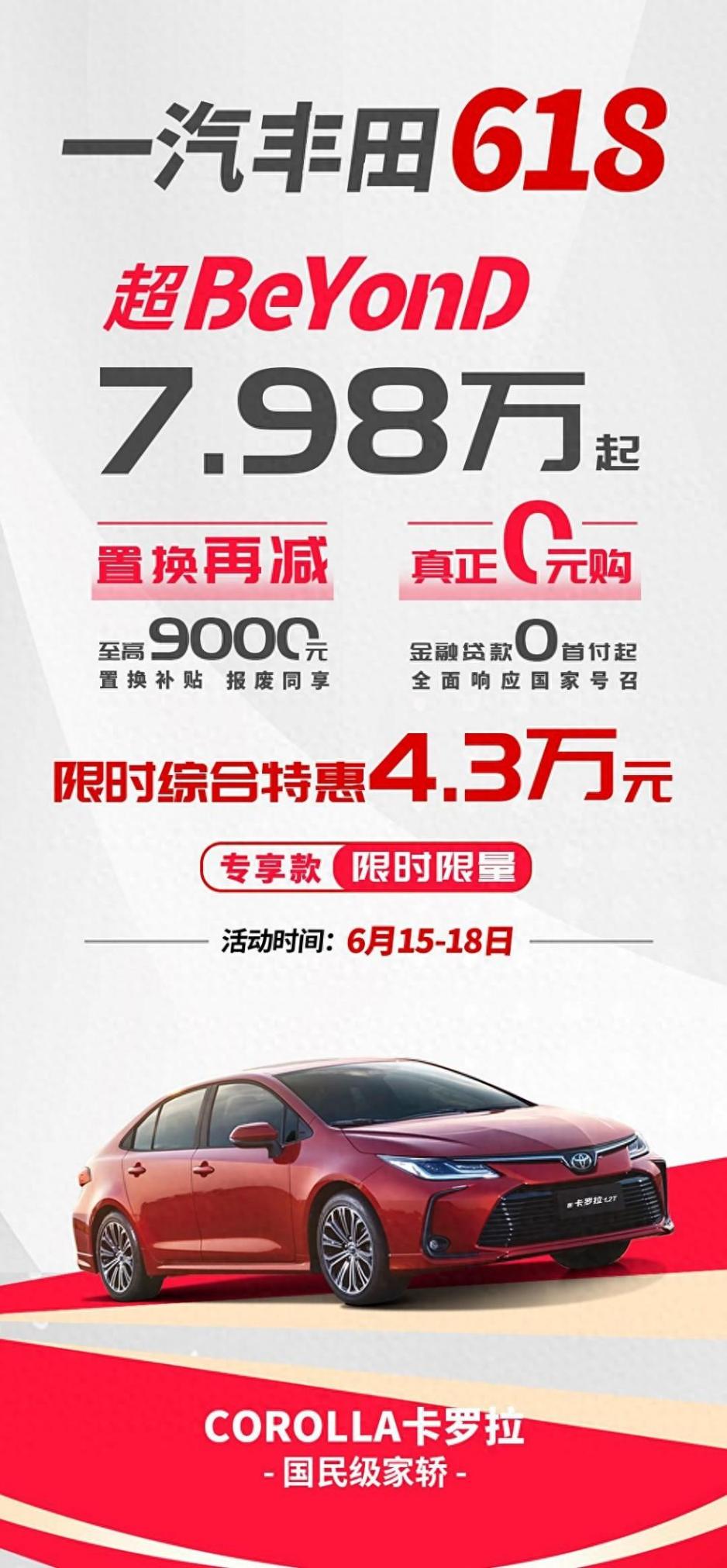 近期一汽豐田搞了一個限時促銷活動,最大號的字體寫著7.98萬起,說得是豐田經典車型卡羅拉,綜合優惠達到了4.3萬元。但為什么說它碰瓷比亞迪呢?