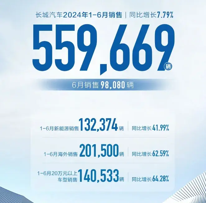 長城汽車6月銷量達到98080輛,1-6月累計銷量達到559669輛,同比增長7.79%。其中1-6月新能源銷售132374輛,同比增長41.99%。具體到品牌方面,哈弗1-6月銷售299738輛,同比增長2.42%。魏牌1-6月銷售19867輛,同比增長9.46%;坦克品牌1-6月銷售116038輛。