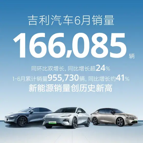 6月份吉利汽車共銷售166085輛汽車,較去年同期增長約24%。1-6月累計銷量955730輛,同比增長34%。另外,吉利汽車的新能源板塊也交出一份不錯的成績單,上半年在吉利、領克、極氪、銀河品牌抓手下,新能源車總銷量達到41.1萬輛。在銷量良好增勢下,吉利汽車計劃將2024年原定190萬輛銷售目標上調至200萬輛。