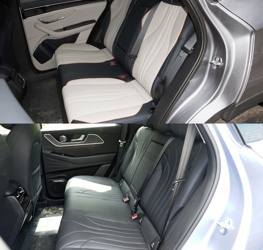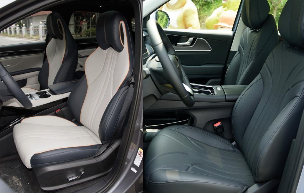 宋PLUS DM-i榮耀版座椅為雙色皮質(zhì),填充物軟硬適中,座椅承托性良好,一體化造型更有運(yùn)動(dòng)感。坐墊高度為4向調(diào)節(jié),還支持通風(fēng)與加熱。風(fēng)云T9座椅也是仿皮材質(zhì),填充物厚實(shí)有彈性,與身體貼合度較高。坐墊長(zhǎng)度充足,靠背與頭枕都有一定的側(cè)向支撐力。中高配車型配置給得很足,除了常規(guī)6向電調(diào),還有4向腰托,3檔通風(fēng)與加熱和10點(diǎn)式氣袋按摩。還提供女王副駕座,主駕的功能全部都有,還增加了電動(dòng)腿托,最大開(kāi)啟角度128°,靠背最大角度125°,可舒適躺平。