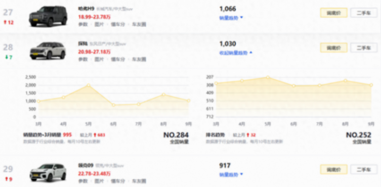 日產探陸深耕海外市場,今年引入國內市場,企圖在競爭激烈的汽車市場中分“一杯羹”。如今懂行的消費者越來越多,日產探陸要想獲得成功,必須有足夠出色的產品力,才能吸引消費者。根據官方給出的汽車銷量排行榜來看,日產探陸的銷量忽高忽低,今年9月份交付1030臺新車,甚至比8月份還要下滑。