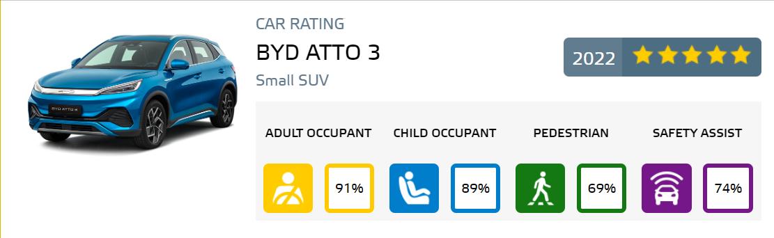 在駕駛員無反應的干預測試中,在滿分25分的情況下,Atto 3以0分收場。在系統故障和防撞能力測試只達到“弱”(Weak)和“足夠”(Adequate)。因車子采用攝像頭偵測交通標志,在速度輔助系統未能正確解讀標志。最終在輔助能力和安全備份分別只獲得55%和35%。