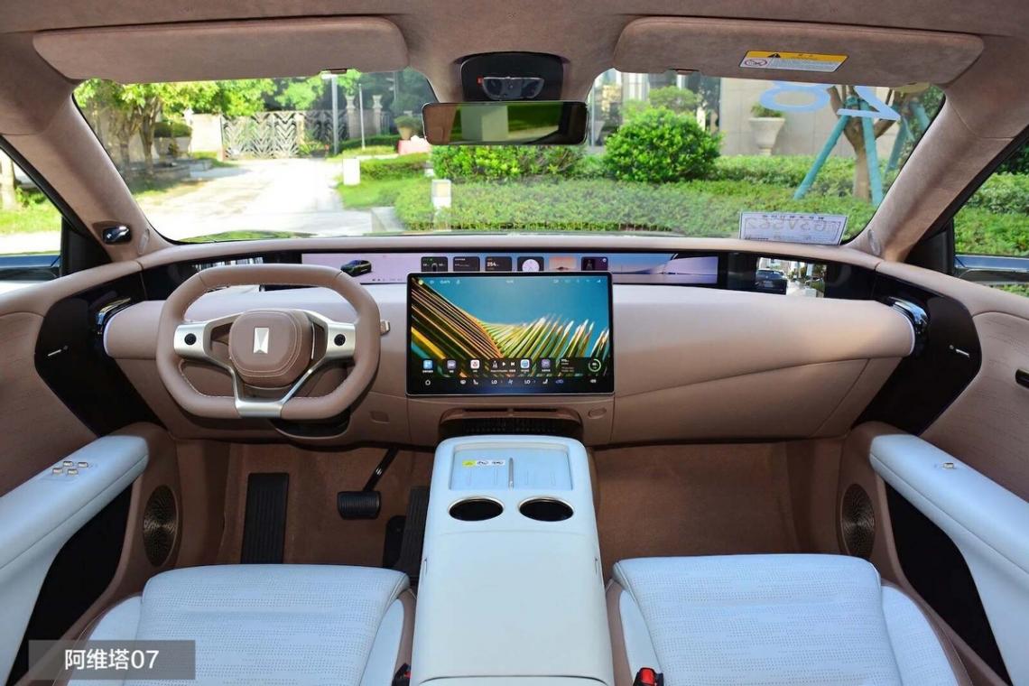 一臺27.99萬元的2024款阿維塔07 Ultra增程版四驅車型,僅僅是一張前臉就顯得極為先鋒,尤其是它把整張前臉都當成了擾流組件,而帶狀燈組仿佛變成了次要的裝飾,就正如電子后視攝像頭、正如圓潤的溜背車尾一樣,阿維塔07就像是一臺開往未來的車。