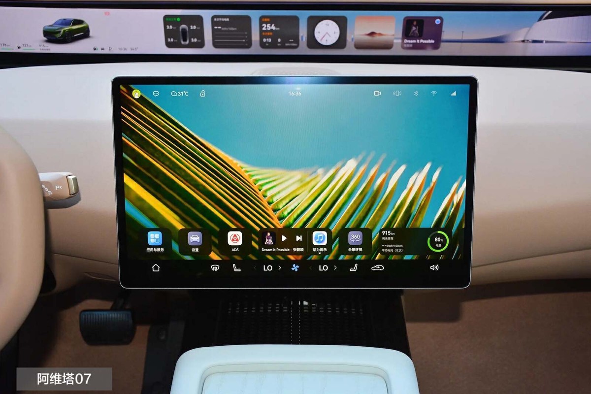 兩款車的座艙風格與外觀都極為匹配,阿維塔07從扁平的D型方向盤到取代傳統儀表的35.4英寸環繞式遠端屏,再到對應電子后視攝像頭的額外雙屏(選裝),都在強調科幻或者說是科技味道。同時,Harmony OS鴻蒙智能座艙還有一塊15.6英寸觸控屏,組成了四屏聯動,并支持與華為設備的接力與投屏,在智能交互體驗上會更流暢,應用也更加豐富。