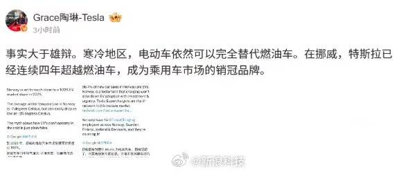特斯拉公司副總裁陶琳今日發文稱,“寒冷地區,電動車依然可以完全替代燃油車。在挪威,特斯拉已經連續四年超越燃油車,成為乘用車市場的銷冠品牌。”