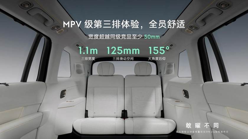 新車座艙用上了全新樣式的方向盤,質(zhì)感很不錯,中控觸摸屏達30英寸(內(nèi)置Flyme Auto系統(tǒng)),分辨率為6K,整體挺有“理想味”;后排的配置更為豐富,車頂同樣擁有30英寸吸頂屏幕,兩張獨立座椅支持電動調(diào)節(jié)、通風、加熱、按摩,還有腿托、扶手、小桌板等。