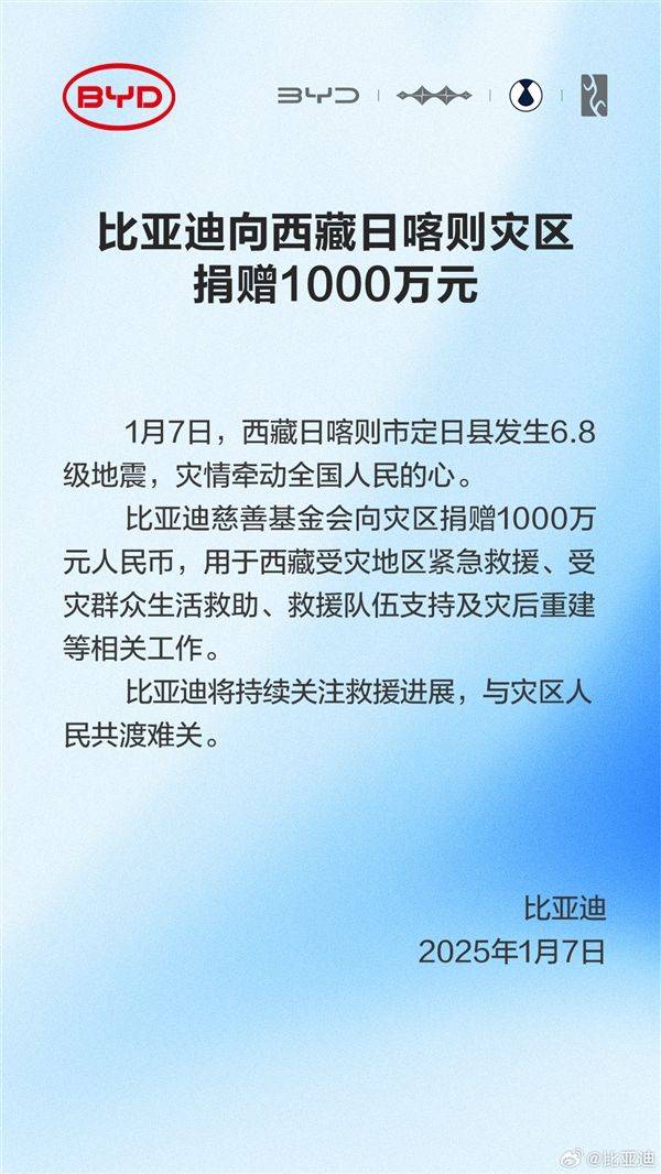 比亞迪慈善基金會宣布向災區(qū)捐贈1000萬元人民幣,這筆資金將用于緊急救援、受災群眾生活救助、救援隊伍支持以及災后重建等多個方面。比亞迪作為國內(nèi)新能源汽車的領軍企業(yè),此次捐款展現(xiàn)了其強烈的社會責任感和擔當精神。